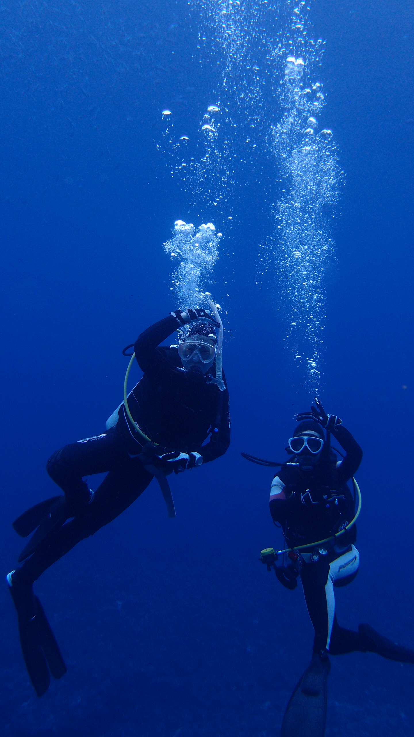 この時間は水面から5メートル下の所で安全停止をする時間でして、3分間はここでびしっと止まっていな いといけなくて結構暇なんですよ。なので、友人とジャンケンしてあっちむいてホイ!とかするんですが 前にカメラを持った友人がいたので二人で『シェー』をして撮ってもらいました。