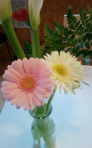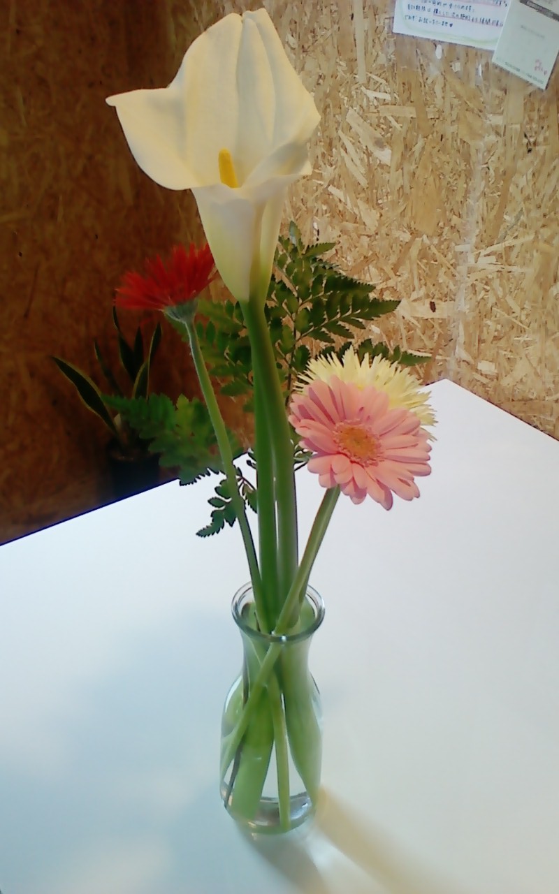 ほら~~♪豪華ですよね。この1番長いお花は『カラー』って言うんだそうです。花言葉は『清純』。私に合ってますね!!なんて。。。このカラーは白い部分がお花ではなく、中にある黄色い角のようなところがお花なんですって。へ~~!!って思いながらお水に差し替えていました。ガーベラはどこのお花屋さんでも見かけると思いますが、花言葉は『神秘』だそうです。