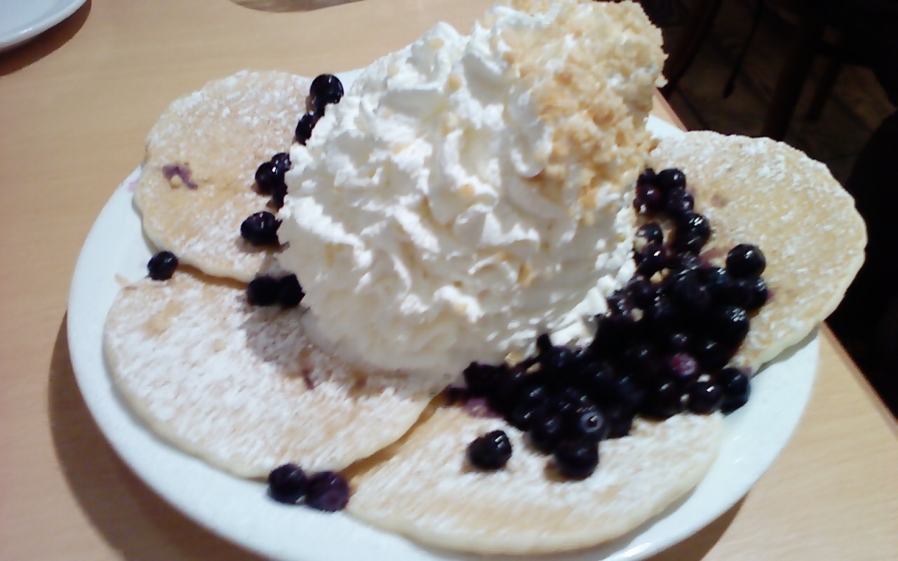 NEC_0399今回は、ブルーベリーです♪生クリームが若干傾いているのは、写真を取る前に私が動かしてしまったからです(汗)!!ここに『ココナッツクリーム』を掛けて食べました。メープルシロップよりも軽い感じでいただけますね。ずっと甘いものを食べてるって辛いじゃないですか??なので、ポテトを注文したんです。それが、また多いしバターもきいていてお腹にズッシリときました・・・。あ~~美味しかった♪当分、パンケーキは良いかなぁ・・・。笑